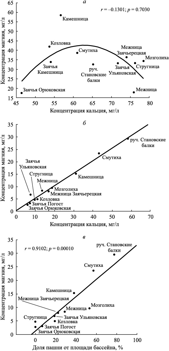 Концентрации ионов магния в постоянных водотоках в весенний и осенний многоводный период прямо пропорциональны доле пашен и обратно пропорциональны доле лесов в бассейне (рис. 3, в). Особенно сильный скачок характерен при снижении лесистости до 7—8 % и росте распаханности до 64—82 % в бассейнах рек Смутихи, Становской балки, Камешницы. Следовательно, при господстве поверхностного стока во время весеннего снеготаяния общим источником этих ионов являются размываемые карбонатные почвы крутых склонов. В зимнем стоке рек (почти целиком связанным с подземным питанием) источники магния и кальция различаются — соответственно пермские мергели и карбонатная московская морена.