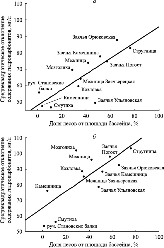 Установлено влияние ландшафтного покрова бассейнов на сезонную и межгодовую вариабельность химического состава вод. Рост лесистости и снижение распаханности способствуют в меженные периоды увеличению вариабельности содержаний гидрокарбонатов, калия, органического фосфора, минерализации (рис. 4, а). При расчете вариабельности с включением данных меженных периодов и трех весенних половодий рост лесистости увеличивает диапазон изменений кальция, магния, гидрокарбонатов, минерализации (рис. 4, б). Как и рост изменчивости модуля стока, это происходит благодаря наличию значительно отличающихся периодов поступления воды из тающего снега по еще замерзшей почве и из грунтовых вод. Наибольшие внутригодовые колебания минерализации характерны для самых залесенных бассейнов — р. Стругницы и верхнего течения р. Заячьей (выше Орюковской). В наиболее распаханных и обезлесенных бассейнах р. Смутихи и, особенно, Становской балки весеннее снеготаяние вовлекает в сток большие объемы вещества распахиваемой почвы и коры выветривания мергелей, поэтому свойства поверхностного стока мало отличаются от характеристик летнего стока, обусловленного подземным питанием, всегда обогащенного кальцием и магнием (см. таблицу). Среди всех исследованных бассейнов для Становской балки характерны наименьшие межсезонные колебания содержаний гидрокарбонатов, магния, натрия, калия, органического фосфора. Отметим, что по минимальной изменчивости концентраций магния в меженные периоды ручей Становской балки сопоставим с родниками.