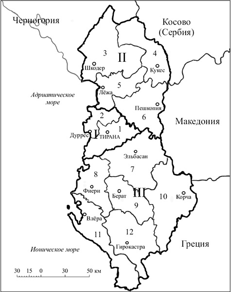 Экономико-географическое районирование Албании (разработано авторами). Римскими цифрами обозначены районы, арабскими — префектуры: I — Центр (1 — Тирана, 2 — Дуррес); II — Север (3 — Шкодер, 4 — Кукес, 5 — Лёжа, 6 — Дибра); III — Юг (7 — Эльбасан, 8 — Фиери, 9 — Берат, 10 — Корча, 11 — Влёра, 12 — Гирокастра).
