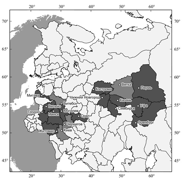 Рис. 2. Распространение бортничества в Европейской России во второй трети XIX в. Светло-серая заливка: губернии, где государственная администрация зафиксировала бортные ухожья в казенных и удельных лесах к началу 1840-х гг. Темно-серая заливка: то же, к началу 1840-х и к началу 1860-х гг.