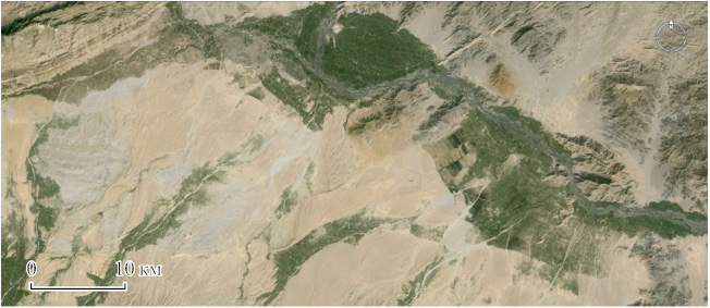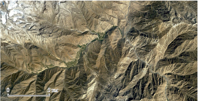 Рис. 3. Земледелие в долине Центрального Гиндукуша, населенные пункты Дашт и Ваджан (юг гор Кохи-Сарикапдара, абс. высота 2500 м, юго-запад провинции Бадахшан) [20, 26, 27].