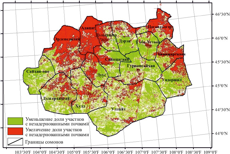 Для сопряженной оценки вклада природных предпосылок и антропогенных факторов на основании составленной карты (рис. 2) по степени трансформации растительного покрова выделены три группы сомонов: 1) с преобладанием процессов деградации более чем на 60 % территории сомона: Эрденедалай, Адацаг, Цагандэлрэг, Баянжаргалан, Дэлгэрцогт; 2) без явного преобладания по площади процессов деградации или восстановления: сомоны Дэлгэрхангай, Хулд, Сайнцаган, Ундершил, Улзийт, Луус, Дэрэн; 3) с преобладанием на более чем 60 % площади процессов восстановления — Сайха-ово, Гурвансайхан, Гобь-Угтаал.