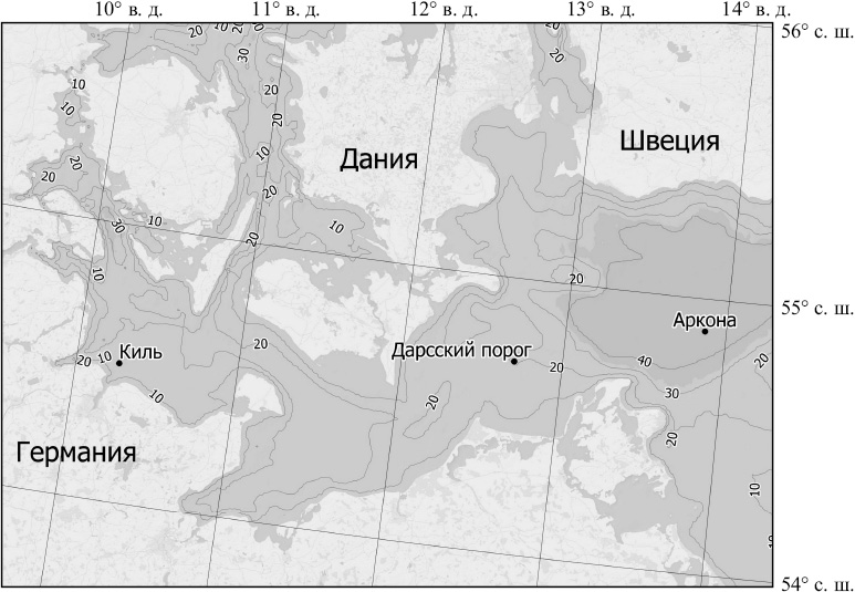 Материалы и методы. В работе были использованы данные натурных наблюдений поверхностной температуры воды Tw, температуры воздуха Ta, относительной влажности f, атмосферного давления на уровне моря P0 и скорости ветра W на станциях Аркона (2003—2016 гг.), Дарсский порог (2004—2016 гг.) и Киль (2012—2014 гг.)1 (рис. 1) мониторинговой сети MARNET (соглашения 2518/2014-002 и 2518/2016-075).
