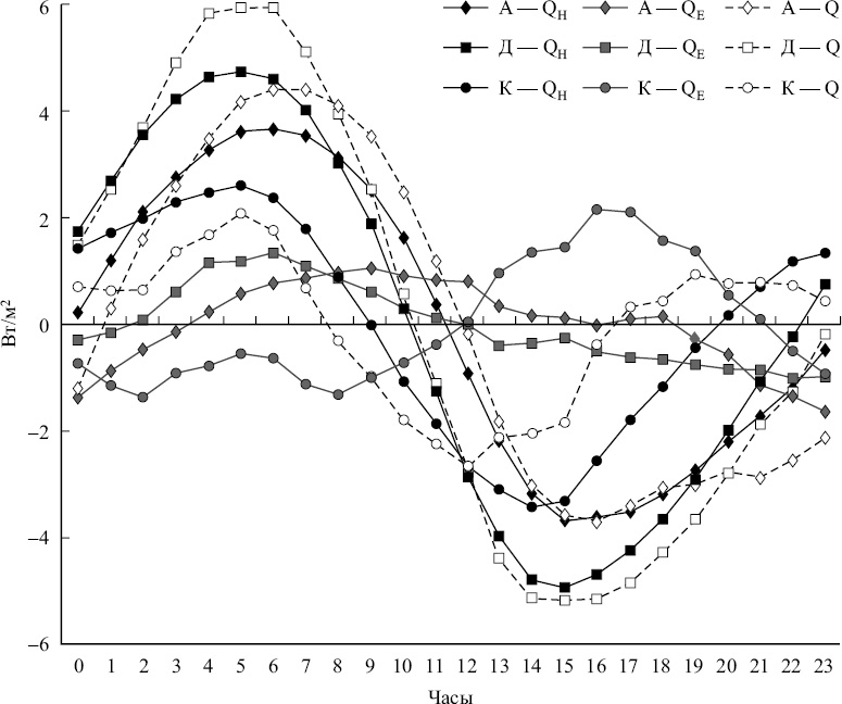Table 2. Harmonic constants of the regular daily variations (averaged and extreme values), averaged monthly for the 2003—2016, of sensible QH, latent QE and total Q heat fluxes (W/m2)