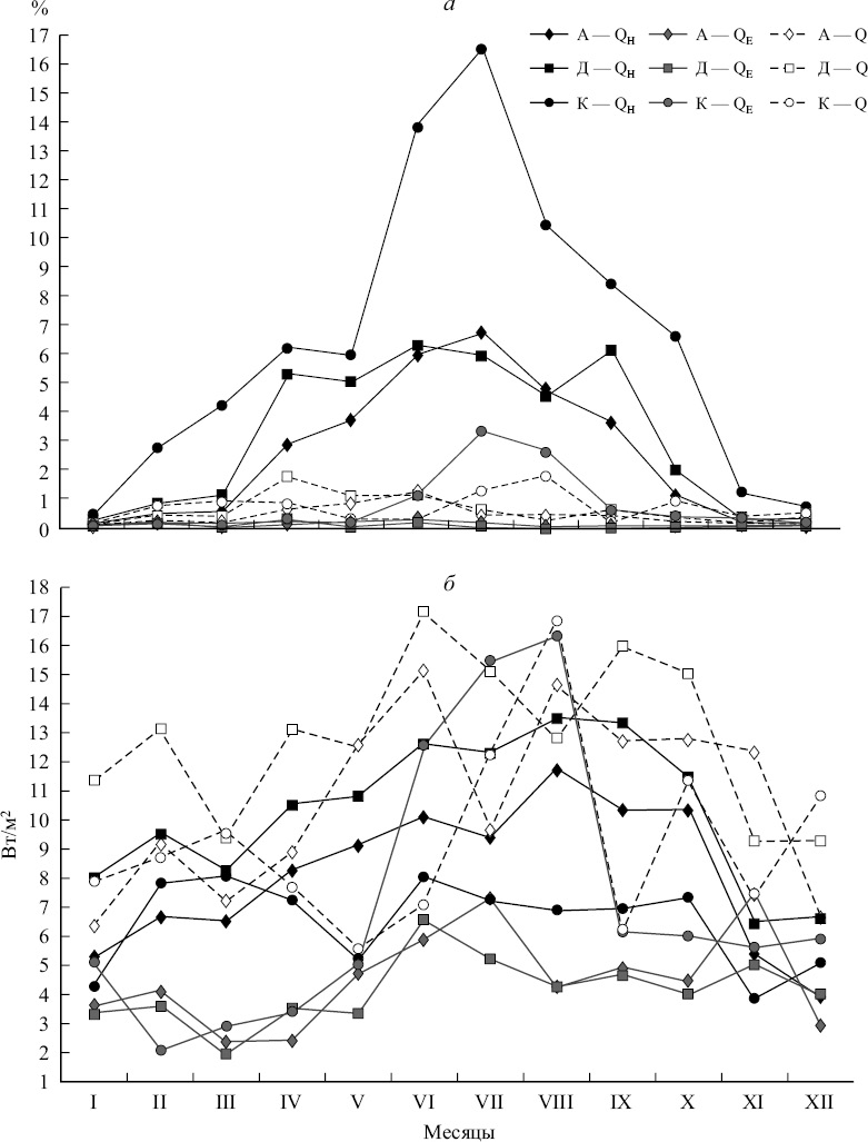 Внутригодовая изменчивость удельного вклада и размаха СХ. Представленный на рис. 3 сезонный ход суточной компоненты удельного вклада и размаха потоков также подтверждает зависимость СХ как от типа потока, так и географического положения станции. Внутригодовая изменчивость удельного вклада СХ для потоков тепла отличается подобием не только между станциями, но и между потоками. При этом для станций Киль и Аркона минимальный удельный вклад СХ потоков отмечается в холодное время года (с декабря по февраль) и составляет — 0.04—0.27 %; максимальный вклад — в июне—августе — 0.3—16.6 %. Для ст. Дарсский порог минимум приходится на август и ноябрь (0.03—0.14 %), а максимум — на апрель (0.2—1.7) (рис. 3, а). Соотношение между величинами максимума и минимума в сезонной изменчивости вклада СХ таково: для QH от 23 (Дарсский порог) до 81 крат (Аркона), для QE от 8 (Аркона) до 41 крат (Киль) и для Q от 10 (Киль) до 30 крат (Аркона).