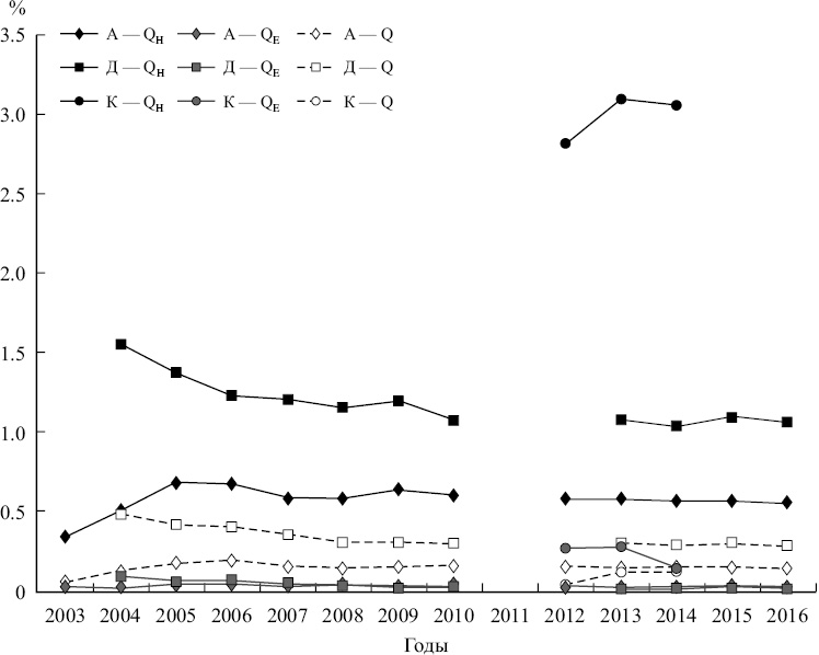 Рис. 4. Осредненная за 2003—2016 гг. межгодовая изменчивость удельного вклада суточной составляющей потоков явного QH, скрытого QE и суммарного Q тепла (%) в юго-западной части Балтики.