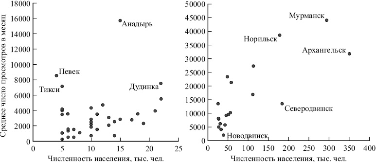 Рис. 2. Диаграммы рассеяния: численность населения городских поселений Арктической зоны РФ (на начало 2018 г.) и среднее число просмотров статей «Википедии» об этих поселениях в месяц (за период с августа 2015 по июль 2018 г.).