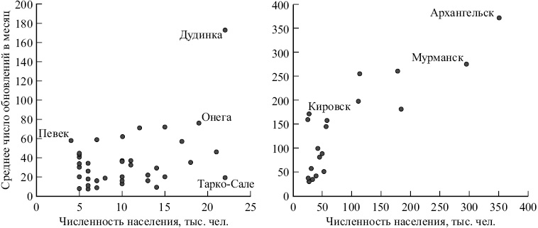 Рис. 3. Диаграммы рассеяния: численность населения городских поселений Арктической зоны РФ (на начало 2018 г.) и среднее число обновлений статей «Википедии» об этих поселениях (за период с августа 2015 по июль 2018 г.).