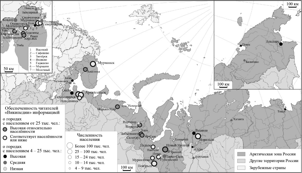 Рис. 4. Карта обеспеченности читателей «Википедии» информацией о городских поселениях Арктической зоны России с населением от 4 тыс. чел.