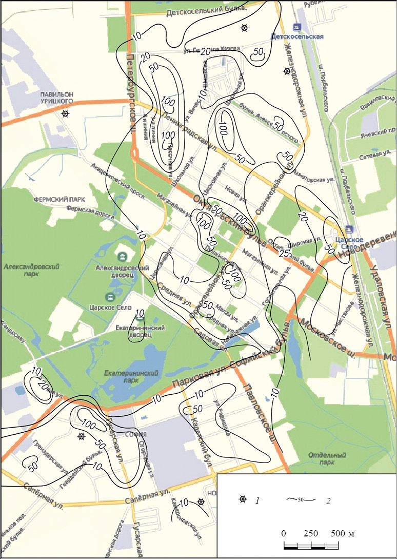 Город Пушкин, будучи в административном отношении составной частью (муниципальным образованием) Пушкинского района Санкт-Петербурга, в территориально-планировочном отношении остается обособленным и своеобразным массивом городской застройки − «городом-садом» и городом-музеем. В целом, как видно из рисунка, распределение значений магнитной индукции отражает исторически сложившиеся архитектурно-планировочные особенности города, такие как: