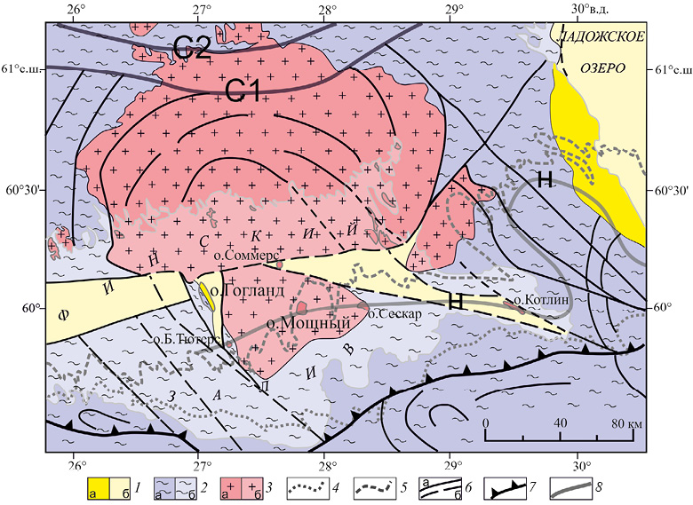 Рис. 1. Геологическая карта восточной части Финского залива с элементами ледникового рельефа. Условные обозначения: 1 — рифейские отложения (1.65—1.1 млрд лет): на суше (а), в акватории (б); 2 — свекофеннские отложения (2.0—1.85 млрд лет): на суше (а), в акватории (б); 3 — граниты рапакиви (1.65—1.6 млрд лет): на суше (а), в акватории (б); 4 — подошва палеозойских отложений; 5 — подошва вендских отложений; 6 — разломы: достоверные (а) и предполагаемые (б); 7—8 — элементы современного ледникового рельефа: 7 — Балтийско-Ладожский глинт (уступ); 8 — конечные ледниковые гряды: Н — Невская, С1 и С2 — Сальпаусселькя 1 и 2.