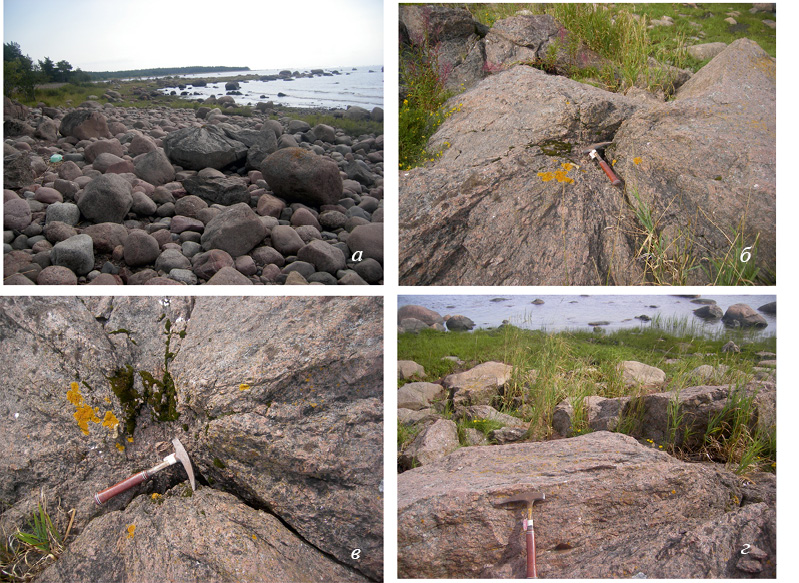 В верхней части этих валунов расположена воронкообразная зона интенсивного дробления, а сам валун в верхней части расколот на крупные фрагменты до 1 м (от 3 до 5 штук), которые мысленно можно сопоставить друг с другом, так как они лежат по его периферии (рис. 3, б). Все разрушенные валуны сложены массивными крупнозернистыми гранитами, имеют близкий химический состав и сопоставимы с породами краевой части Выборгского массива гранитов рапакиви. Среди многих сотен крупных валунов, расположенных вдоль береговой линии о. Мощный, обнаружено только 14 разрушенных экземпляров. Вероятно, часть их пропущена и их больше, но все же это сравнительно редкие образования.