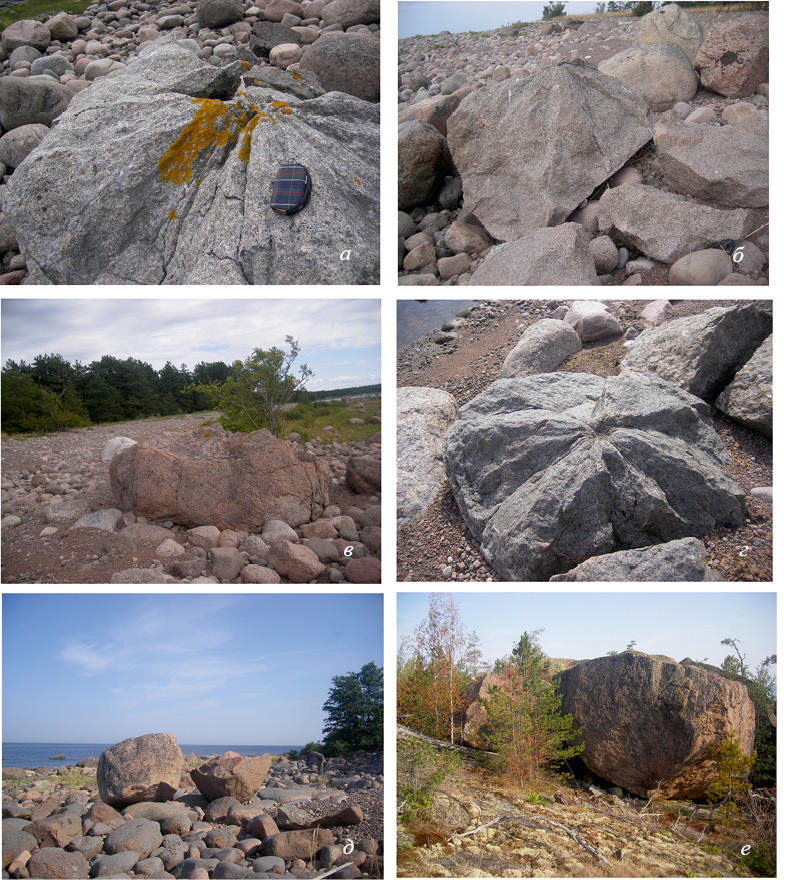 Рис. 3. Различные по форме образцы разрушенных валунов на о. Мощный (а—г) и о. Гогланд (д, е): д — рядом с разрушенным валуном, который в зоне прибоя потерял отколовшиеся куски, лежит крупный валун; е — развал гранитных валунов на доледниковой выровненной поверхности кварцевых порфиров.