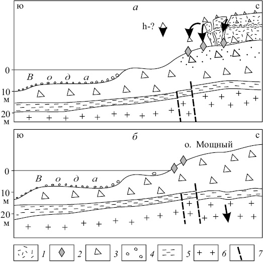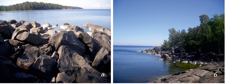 К этому следует добавить, что о. Мощный опускается и валуны, которые были за пределами волновой деятельности, постепенно вовлекаются в процесс прибрежного окатывания. В этом случае вначале окатываются обломки, отколовшиеся от верхней части валуна, а затем и его оставшаяся часть. При этом весь остров покрыт слоем ледниковой морены, в которой встречаются и крупные валуны. Имеются и невысокие дюны. Как показано на геологических картах (рис. 1) и [10], под мореной залегают вендские отложения, а ниже них фундамент, представленный гранитами рапакиви. Коренных выходов дочетвертичных горных пород на острове нет. Вероятно, что разрушенные валуны встречаются по всей поверхности острова, но они плохо видны из-за густой растительности. Те валуны, что по мере опускания острова, приближаются к области волновой абразии, постепенно освобождаются от растительности. Они хорошо видны, но в дальнейшем, попав в зону прибоя, они теряют свои примечательные особенности