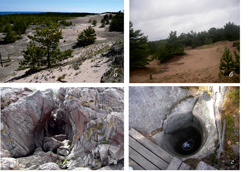 Рис. 6. Продукты ледниковой деятельности: а, б — дюны на о. Большой Тютерс и о. Мощный, в, г — ледниковые колодцы: в — о. Большой Тютерс и г — р-н конечной гряды Сальпаусселькя 1.
