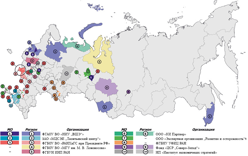 При учете проигранных заявок на участие в конкурсах к общероссийским по территориальному поведению можно было бы отнести также и другие активные, но менее удачливые организации, например Центр перспективных экономических исследований АН РТ, Новосибирский государственный университет экономики и управления и ООО «Ки Партнер».