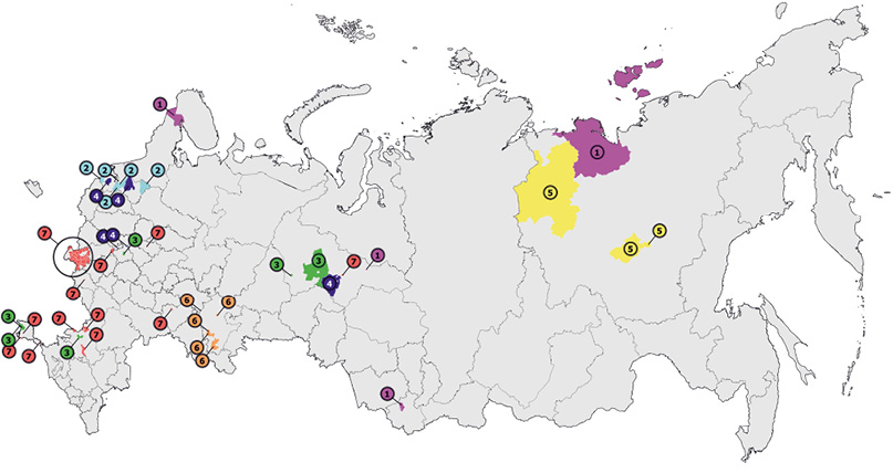 В группе восьми общероссийских организаций можно выделить две подгруппы: четыре организации, работавшие более чем в двух регионах, и четыре организации, работавшие только в двух регионах. В первой подгруппе три московские и одна тюменская организации. Любопытно, что все четыре пересекались лишь в одном регионе — ХМАО, две работали в Крыму, две — в Московской области. В остальном рынок общероссийских поставщиков этой подгруппы оказался поделен без пересечений. Во второй подгруппе пересечения отмечены на территории Московской области и Пермского края.