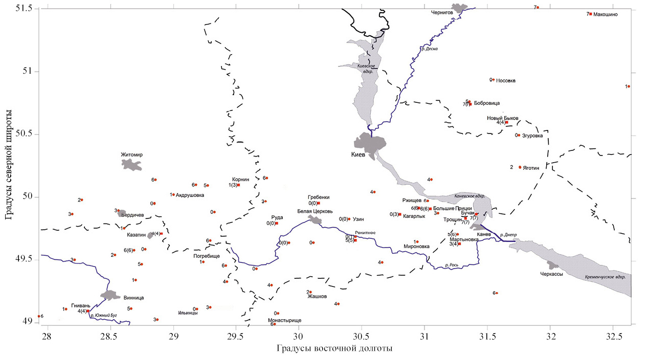 Рис. 1. Пункты расположения обследованных действующих и бывших сахарных заводов. Кружки - объекты, обследованные в 2012-2015 гг.; квадратики - объекты, обследованные и в 2012-2015, и в 2018-2019 гг.; цифра вне скобок - стадия разрушения при первом обследовании, цифра в скобках - при втором обследовании (если таковое имело место). Пояснения в тексте.