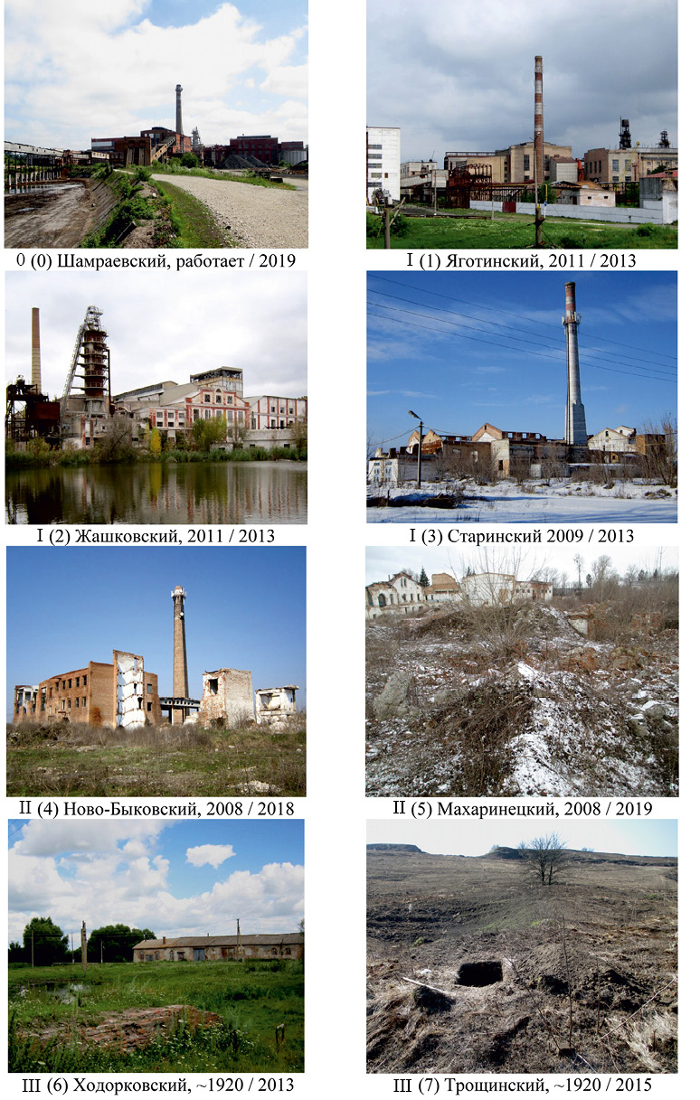 Демутация производственных ландшафтов сахарных заводов. На территории Украины было пять «волн» забрасывания сахарных заводов, которое обусловливалось причинами исторического, экономического и технологического характера (1860-е гг.; середина 1880-х гг.; конец 1910-х—первая половина 1920-х гг.; первая половина 1940-х гг.; середина 1990-х—начало 2010-х гг.). После окончательной остановки и забрасывания завод начинает разрушаться. В наше время ему в этом «помогали» искатели металлолома и добытчики кирпича и строительного камня. В длительном процессе разрушения-саморазрушения «техногенного покрова» нами выделено 8 стадий [21, с. 99—100], включая нулевую стадию работающего завода (рис. 2).