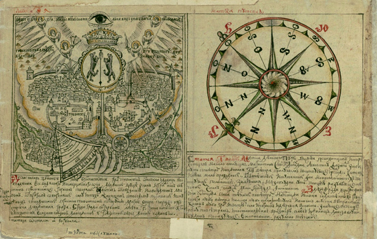 Еще одним ключом к пониманию состава общих источников и методов «написания» ХЧК служит иллюстративная составляющая, не относящаяся напрямую к картографическому материалу. Например, иллюстрация на листе 8 (рис. 1), представляющая собой сложносоставную композицию в виде карты, на которой изображен г. Тобольск. Композиция карты ориентирована на север. На переднем плане рисунка расположены изображения предметов, являющихся принадлежностью картографа или штурмана, в том числе стилизованное изображение так называемого градштока или «посоха Иакова». В простейшем варианте это длинная градуированная рейка, вдоль которой перемещается поперечная планка, на концах которой обычно укрепляли небольшие стержни — визиры. Визир с отверстием имелся и на конце основной линейки. На «baculus Jacob» (в месте, где на реальном астрономическом посохе располагался визир) опирается круглый медальон в виде щита с гербом Сибирского царства. Медальон вписан в изображение перевернутой полусферы, озаренной двенадцатью солнечными лучами. По обе стороны от медальона расположены шесть изображений архангелов. Слева — святой Михаил, держащий в руках восьмиконечный крест и орудия страстей — копье и палка с губкой, справа святой Гавриил, держащий в руках пламенеющий меч. Вверху, в центре — изображение человеческого глаза.