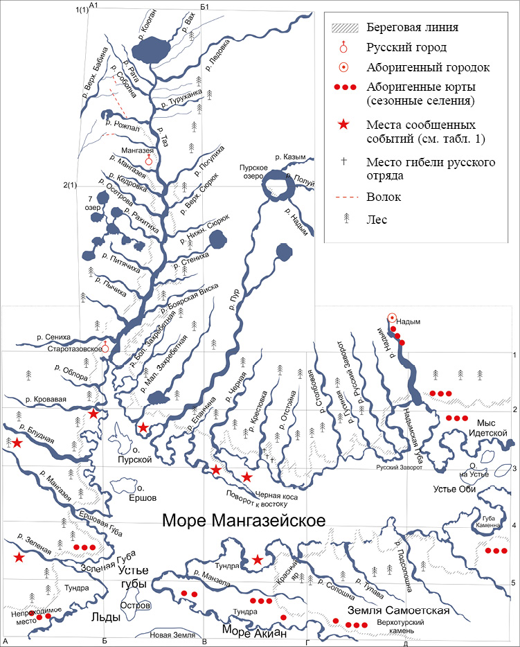 В ходе проработки рисунка мы сохранили авторскую разбивку карт (квадраты от А-1 до Д-5), кроме того, для ориентации добавили ее на вклейку (квадраты А1-1(1)—Б1-2(2)). Чтобы не перегружать наш рисунок надписями, на нем мы оставили лишь обозначения основных топонимов; историческая информация вынесена в отдельную таблицу и прикреплена к соответствующему участку рисунка (табл. 1). В рамках настоящего исследования нас в первую очередь интересует основная часть чертежа, где обозначена береговая линия моря; течение р. Таз, отраженное на вклейке, будет использован лишь побочно. Топонимический материал, необходимый для локализации определенных объектов, также отражен отдельно с учетом расположения на определенном участке (табл. 2).