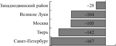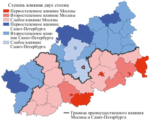 Население муниципальных образований северной части региона тяготеет к Санкт-Петербургу. Первостепенное влияние северной столицы отмечено в Бологовском, Сандовском, Торопецком районах и Удомельском городском округе. Еще 15 муниципалитетов испытывают второстепенное влияние, и лишь в двух отмечено слабое влияние Санкт-Петербурга. Всего 21 муниципальный район и городской округ тяготеют к Северной столице (рис. 3).