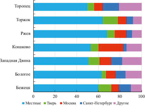 В большинстве муниципалитетов первое место занимает региональный центр — Тверь (рис. 2). При этом в десяти муниципалитетах Тверь осталась на втором месте. В четырех районах (Зубцовском, Кимрском, Калязинском, Ржевском) и двух городских округах (Ржеве и Кимрах) на первое место вышла Москва. Для четырех районов северной части региона (Торопецкого, Бологовского, Удомельского и Сандовского) на первое место вышел Санкт-Петербург.