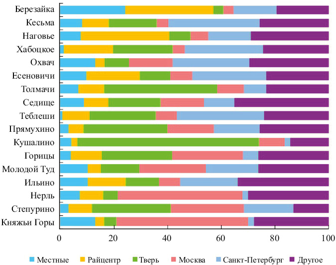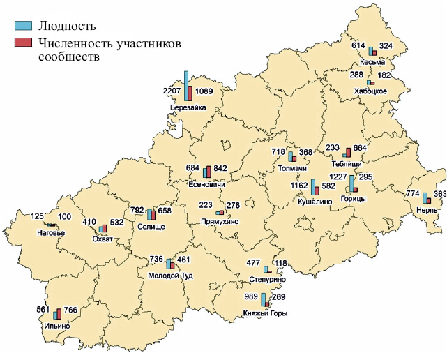 Подписчики исследуемых сообществ чаще всего представляют Тверь, Москву, Санкт-Петербург, районный центр и непосредственно сам исследуемый населенный пункт. Самую низкую долю местных имеют СНП Теблеши и Хабоцкое. Наибольшая доля подписчиков из районных центров отмечена в д. Наговье Торопецкого района (более 32 %). Самой низкой долей подписчиков из райцентра (ниже 5 %) отличаются четыре СНП (Княжьи Горы, Кушалино, Молодой Туд и Охват). Отчасти это можно объяснить слабостью и непривлекательностью центров Зубцовского, Рамешковского, Оленинского и Пеновского районов. Наибольшую долю местных жителей (32 %) имеет поселок Березайка: это объясняется его сравнительно высокой людностью и статусом поселка городского типа в прошлом.