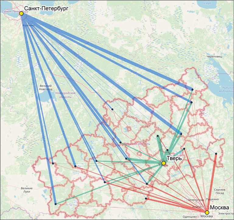 Рис. 3. Степень влияния Москвы и Санкт-Петербурга на муниципалитеты Тверской области.