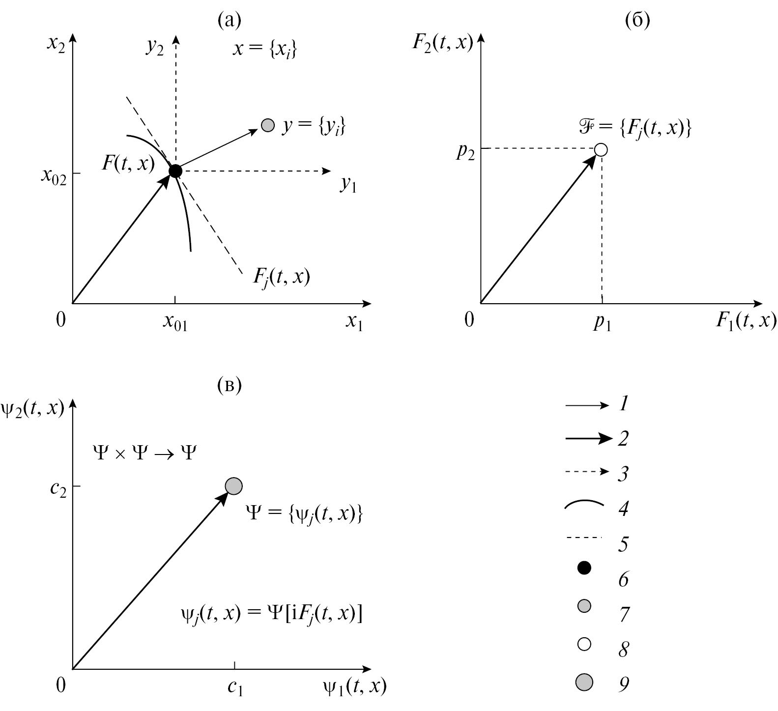 Fig. 1. Step-by-step improvement of spatial and temporal analysis: a is a two-dimensional factor space x = {xi}∈X(t,x); б is a representation of a fiber bundle in the form of a vector function F = {Fj(t,x)}; в is a Hilbert functional space Ψ = {ψj(t,x)} as superposition of functions of the form (3). Symbols: 1 – coordinate axes of variables and functions; 2 – vectors of various shapes (radius-vector, vector-function, superposition of Hilbert functions); 3 – local coordinates y = {yi}; 4 – curve or surface of a function F(t,x) of a manifold M; 5 – line (ray, plane) Fj(t,x), tangent at point x0j. The states of the system: 6 – at the point F(t,x0); 7 – in the local coordinate system y = {yi}; 8 – in the form of a vector-function with weight vector p = {pj}; 9 – in the form of a superposition of Ψ-functions with weight vector c = {cj}.