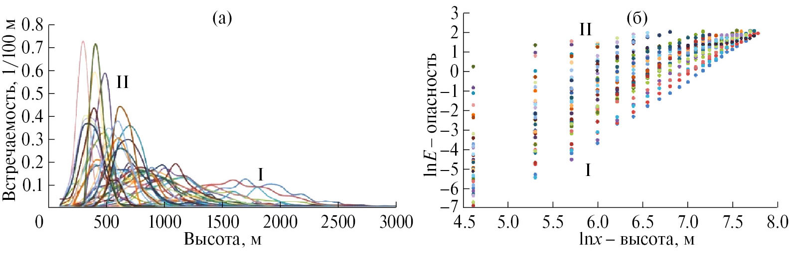 Рис. 2. а – сглаженные кривые распределения (встречаемости) разных геомов по высоте с шагом 100 м; б – зависимость величины интегрированной опасности от высоты местоположения (логарифмическая шкала): I – группа горных геомов, II – группа подгорных геомов.
