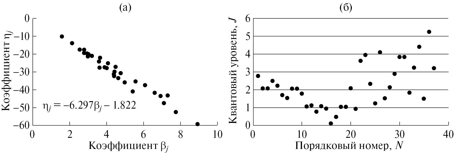 Рис. 3. а – зависимость коэффициентов ηjи βjрасчетной формулы lnEj(x) = βjlnx+ηj; б –квантовые уровни J К-состояний геомов по коэффициенту βj. Точки – расчетные данные, линии – квантовые уровни J = βjym/π-1.