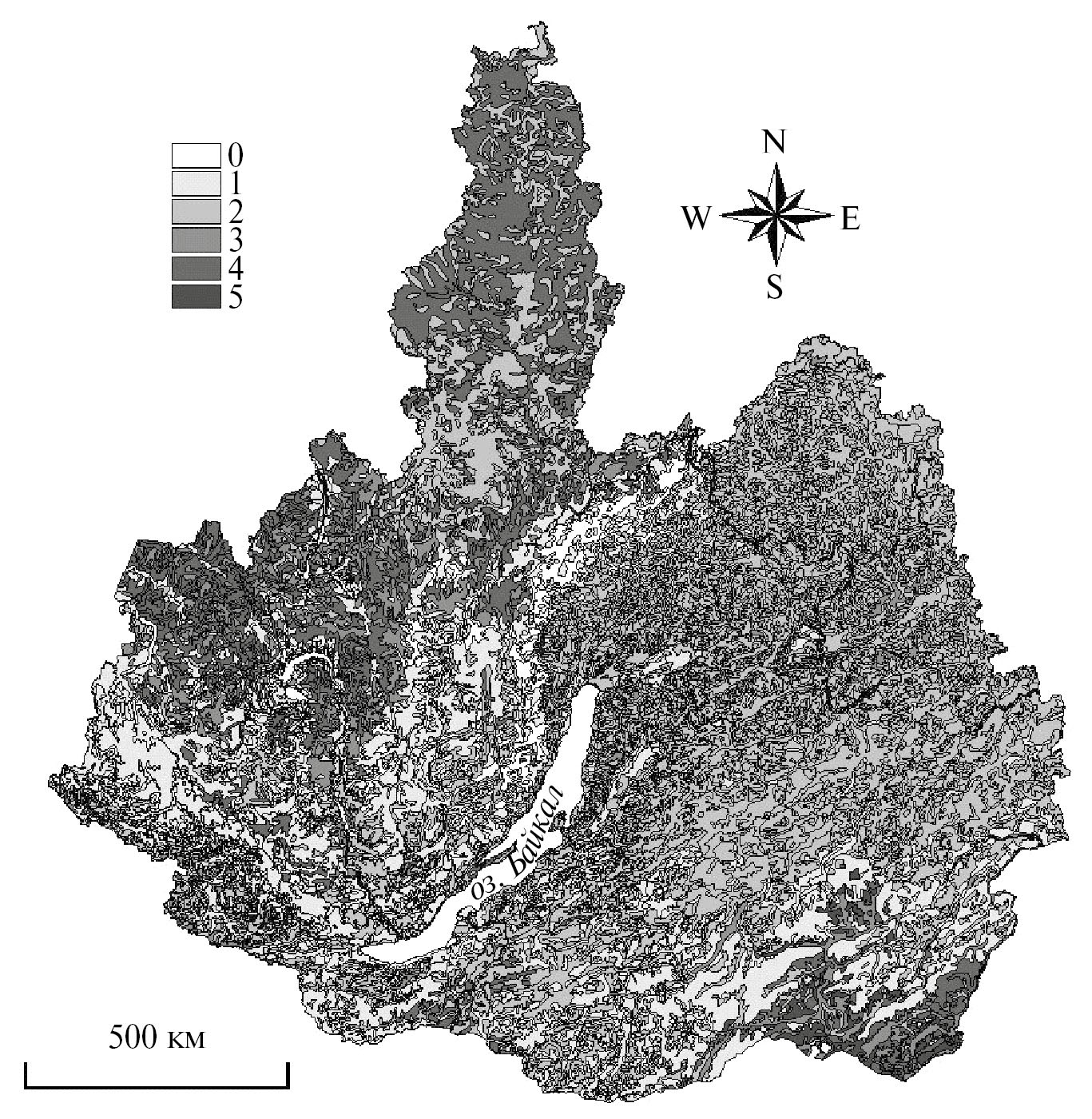 Fig. 5. Quantum levels (0–5) of the spatiotemporal variability of the geomes of Baikal Siberia according to the geographical characteristics of the location height. The boundaries of different geome sare shown.