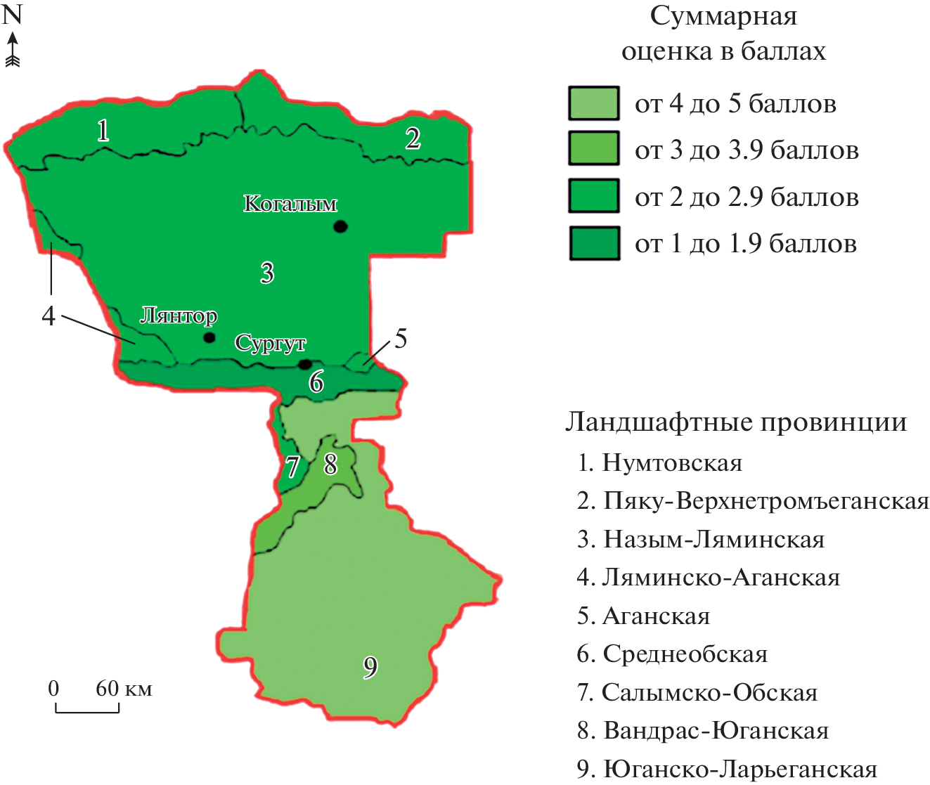 —The landscape and environmental analysis was carried out on the example of the Surgut district of the Khanty-Mansiysk Autonomous Okrug-Yugra, where the main factor in the degradation of natural objects is pollution of the territory as a result of mining, which accounts for up to 80% of emissions. Landscape provinces as nodal geosystems were used for the analysis. A general structural and morphological assessment of landscapes, an assessment of unfavorable ecological and geographical processes, anthropogenic transformation and ecological infrastructure of landscapes were carried out, and ecologically significant factors of the territory were identified. As a result of the conducted research, a map was compiled reflecting the spatial differentiation of the state of landscape provinces, taking into account anthropogenic impact. It has been established that the best landscape and ecological well-being is possessed by the southern territory of the district (Yugansk-Laryegan province), which is characterized by the containment of anthropogenic activity due to the creation of the Yugansk Nature Reserve. The Vandras-Yugan province serves as a buffer between anthropogenic and least modified natural landscapes, occupying an intermediate position in the assessment. The central part of the Surgut district received the most massive "blow" to the landscapes, as the main transport routes, pipelines, and residential settlements are concentrated here. The northern part of the Surgut district is characterized by waterlogging processes, a high degree of overgrowth and an average degree of transformation of natural landscapes.
