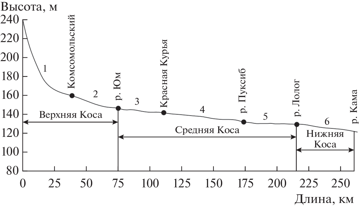 —The article is devoted to identification of peculiarities of development of channel processes in river valleys with distribution of glaciolacustrine terraces. Kosa river was chosen as the largest right tributary of the upper Kama. The resources of GoogleEarthPro and Yandex Maps were used in the process of interpretation of space images and obtaining quantitative information. The morphodynamic types of a river channel was made on the basis of the analysis of elements of floodplain-channel landscape complexes. The indicator of the ratio of the width of the floodplain to the width of the valley was considered as a feature of the development of channel processes in the areas of the distribution of the glaciolacustrine terrace. This ratio is 1 : 1 at the upper Kosa river outside the Kosinskaya Lowland. It is 1 : 9 at the middle Kosa river, and 1 : 3 at the Kosa downstream. The location of the meander belt in the left of the valley side is a feature of the development of channel processes. This indicates the presence of a stable and long-term planform channel changes from the east to the west in the past. The leading morphodynamic channel types are free meanders and confined straight channel for the Kosa upper stream. In the Kosa middle stream, in which most of the valley is represented by a glaciolacustrine terrace, confined bends already play a significant role in the structure of morphodynamic types of a river channel, while maintaining the leading role of free meanders. At the same time, a high proportion of the distribution of the straight confined channel is observed.