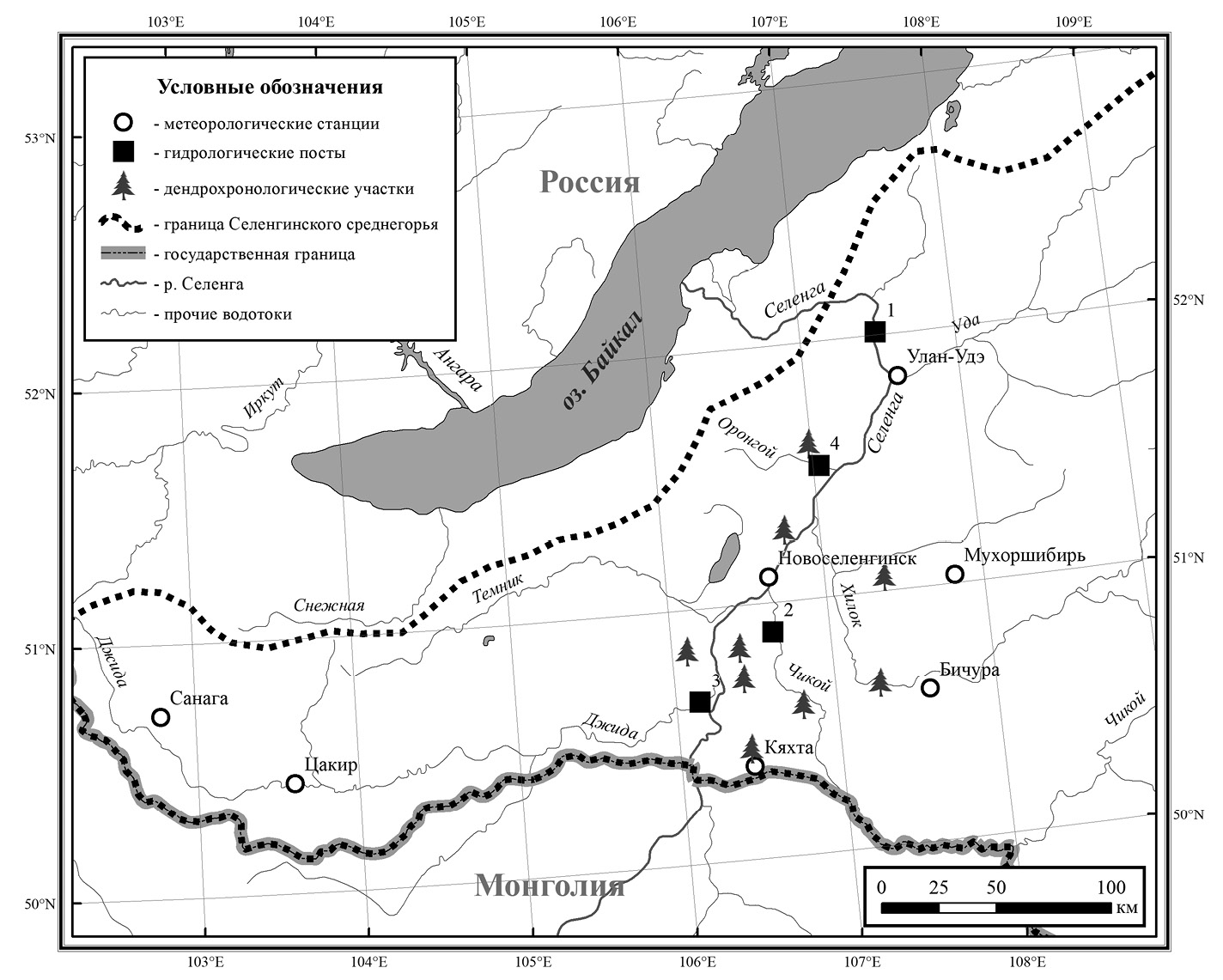 Рис. 1. Территория исследования и расположение на ней метеорологических станций, гидрологических постов (1 — р. Селенга–рзд. Мостовой; 2 — р.Чикой–с. Поворот; 3 — р. Джида–с. Джида; 4 — р. Оронгой–Оронгойский мост) и дендрохронологических участков.