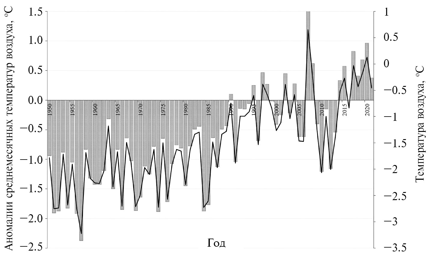 Анализ динамики среднегодовой температуры воздуха показывает, что на исследуемой территории появление положительных аномалий, рассчитанных как отклонения от среднего за базовый период 1991–2020 гг., наблюдается только начиная с 1990 г. (рис. 2). Если до 1989 г. все температурные аномалии были отрицательными, то за последние 32 года (с 1990 по 2021 гг.) отрицательные аномалии составляют менее 50%, а с 2014 г. на протяжении последних 8 лет фиксируются только положительные аномалии.