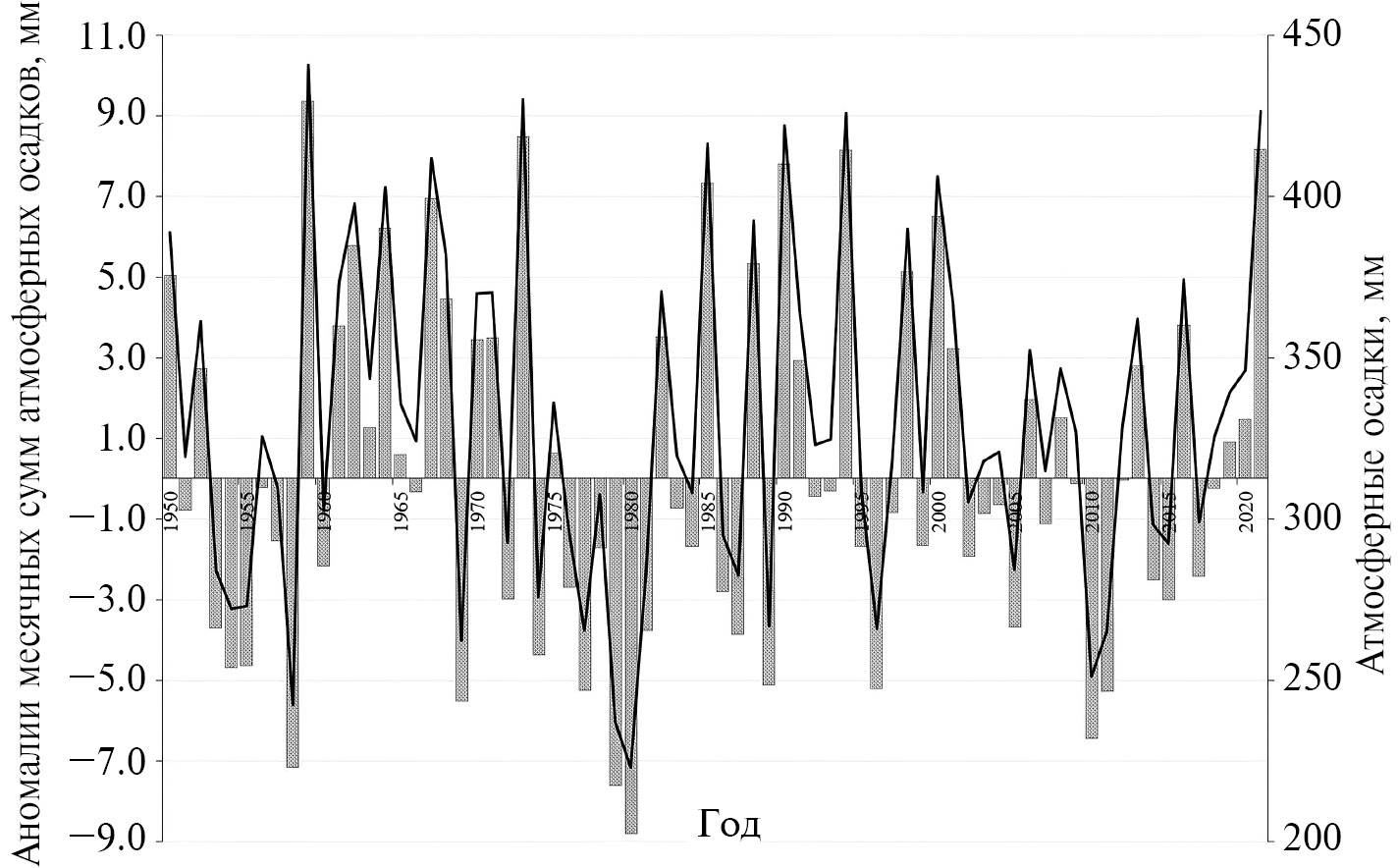 Анализ отклонений атмосферных осадков от многолетнего среднего за 1950–2021 гг. показывает, что в среднем по территории существенно меньше среднего осадков выпадало в 1980 г. (223 мм), а самый влажный в среднем по территории был 1959 г., когда средняя сумма годовых осадков составила 441 мм (рис. 3).