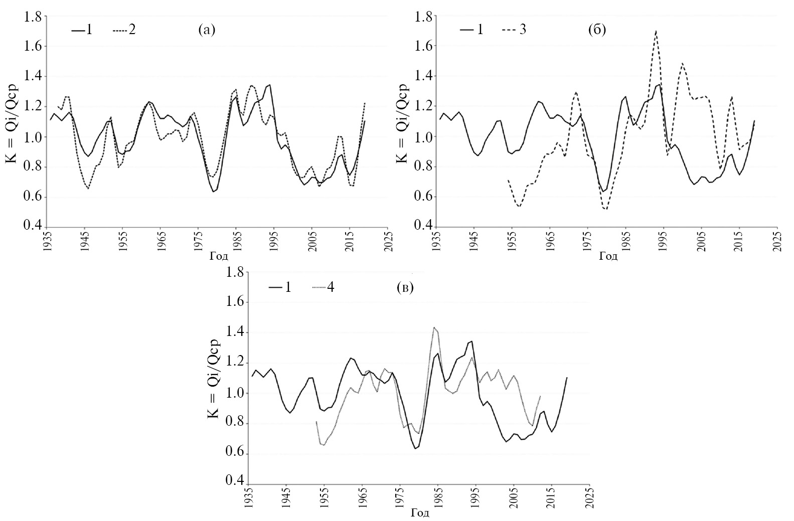 Рис. 4. Сравнение многолетних изменений годового стока р. Селенги со стоком р. Чикоя (а), р. Джиды (б) и р. Оронгоя (в), сглаженных с помощью пятилетнего скользящего осреднения (1 — р. Селенга–рзд. Мостовой; 2 — р.Чикой–с. Поворот; 3 — р. Джида—с. Джида; 4 — р. Оронгой—Оронгойский мост).