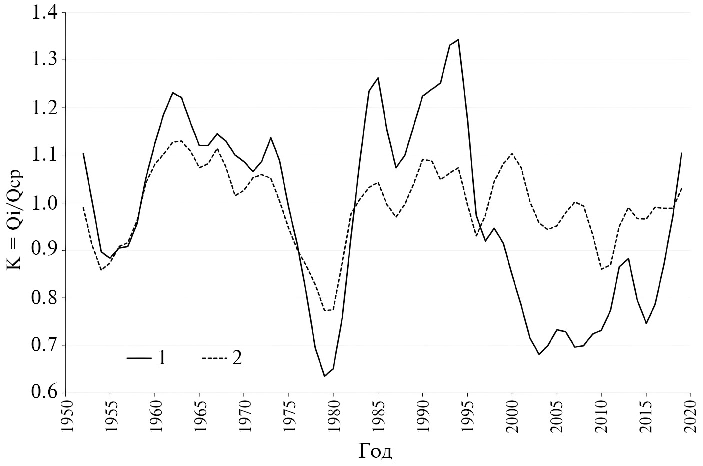 6. Fig. 5. Long-term changes in the annual river flowof Selengi near the rzd. Mostovoy (1) and annual amounts of atmospheric precipitation averaged over the territory of the Selenga midlands (2), smoothed using five-year moving averaging.