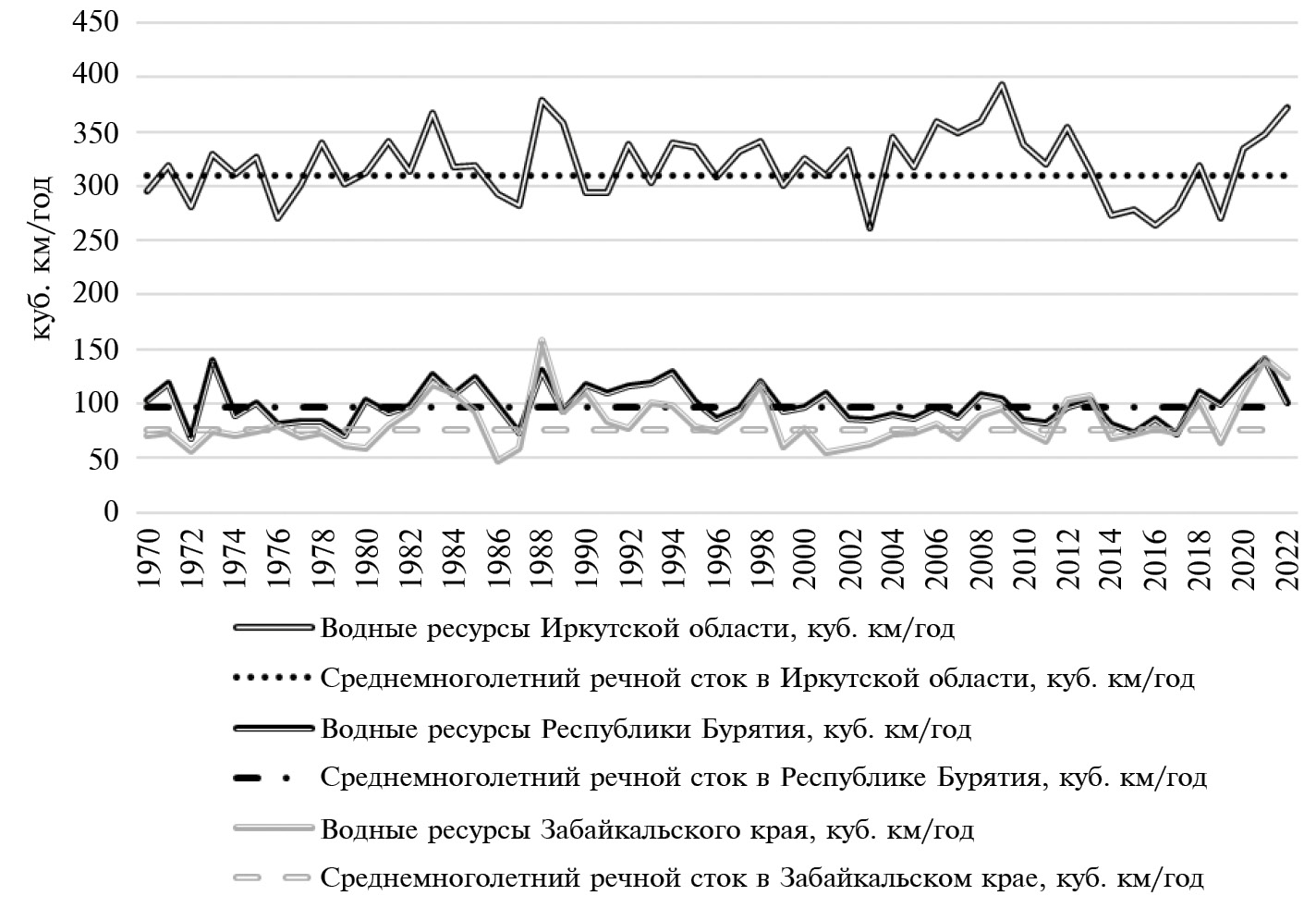 Среди субъектов Байкальского региона наибольшими показателями по водным ресурсам (куб. км/год и среднемноголетний речной сток, куб. км/год) выделяется Иркутская область, затем с близкими показателями между собой идут Республика Бурятия и Забайкальский край. Среднемноголетний речной сток у Иркутской области составляет 309.4 куб. км/год [6], у Республики Бурятия — 97.1 [7], у Забайкальского края — 75.6 [8] (рис. 3).