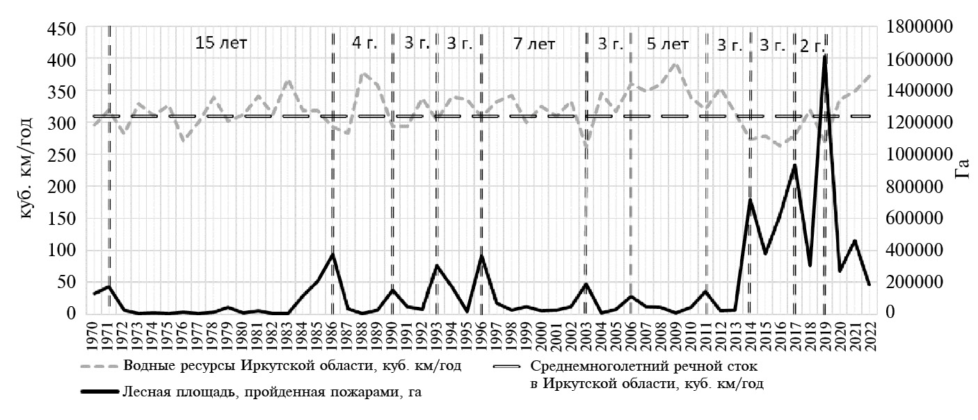 Рис. 5. Иркутская область: сопряжение данных с 1970 по 2022 гг. по водному стоку с лесной площадью, пройденной пожарами.