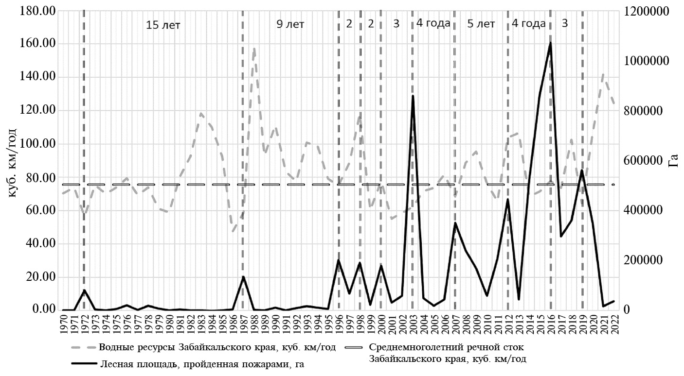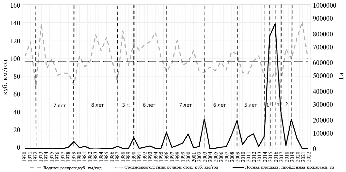 Рис. 7. Забайкальский край: сопряжение данных с 1970 по 2022 гг. по водному стоку с лесной площадью, пройденной пожарами.