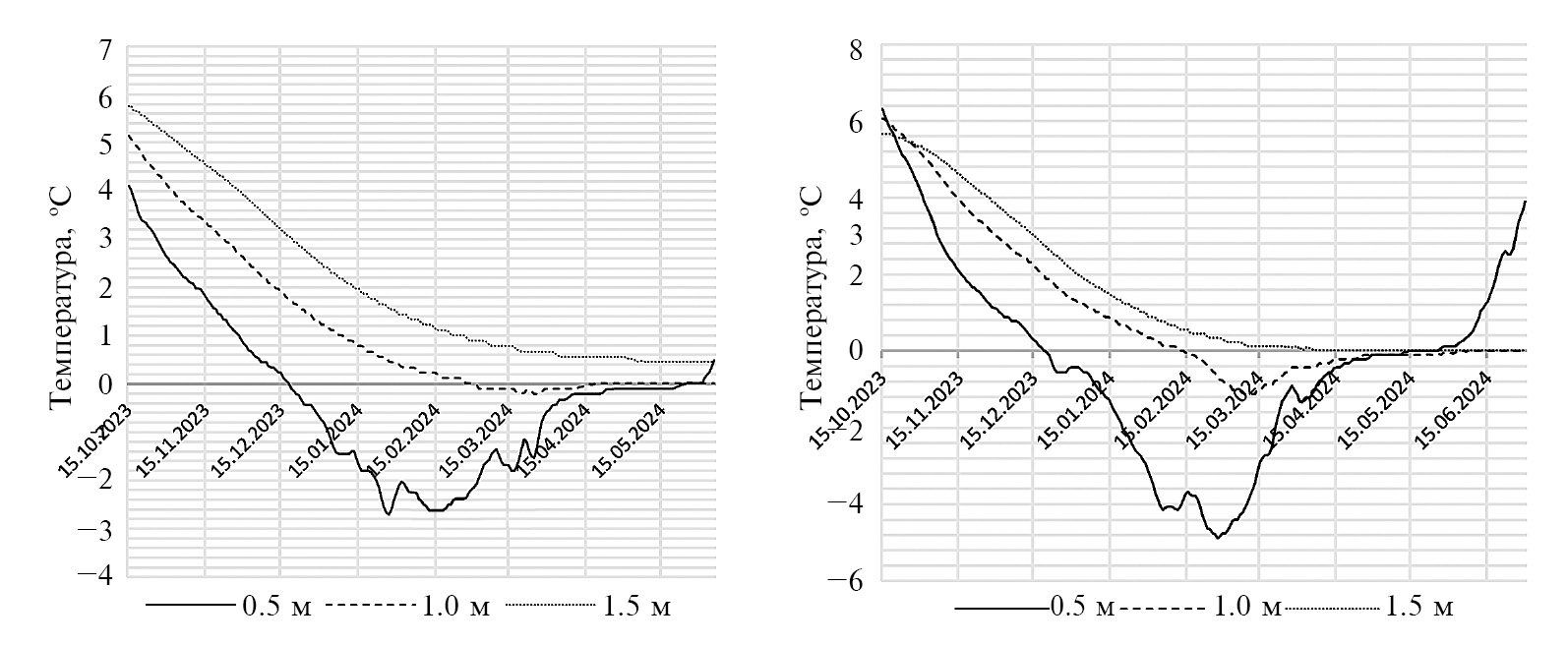 Рис. 4. Динамика температуры слоя сезонного промерзания в 2022–2023 гг. (а) и 2023–2024 гг. (б).