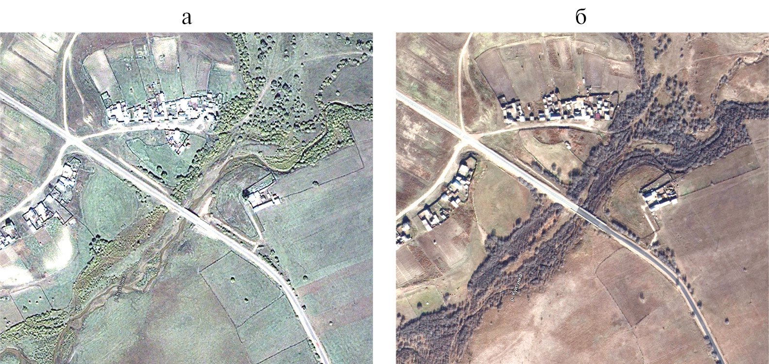 Рис. 5. Зарастание прирусловых участков пойм р. Куйтунка ивой на снимках Google Earth): а — 2004, б — 2024 г.