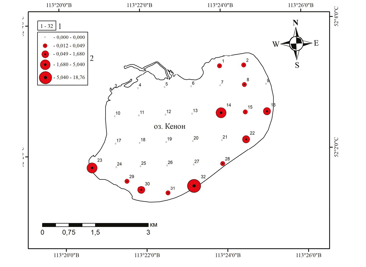 2. Fig. 1. Distribution Gm. fasciatus in Kenon Lake, october 2022 y. 1 — numbers of research stations, 2 — biomass values, g/m2.
