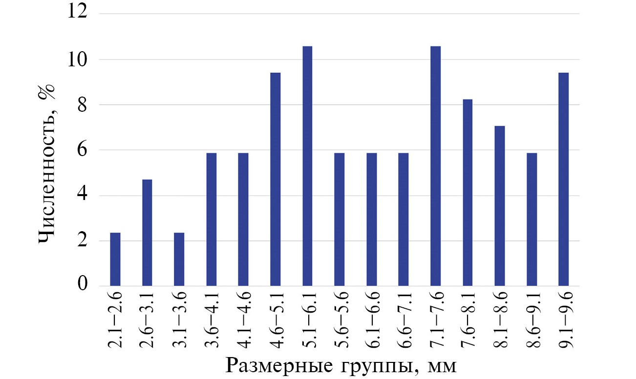 Популяция Gm. fasciatus в ноябре 2022 г. была представлена широким размерным диапазоном особей от 2.2 до 9.7 мм (рис. 3), в популяции преобладали особи с размерами 4.6–9.6 мм.
