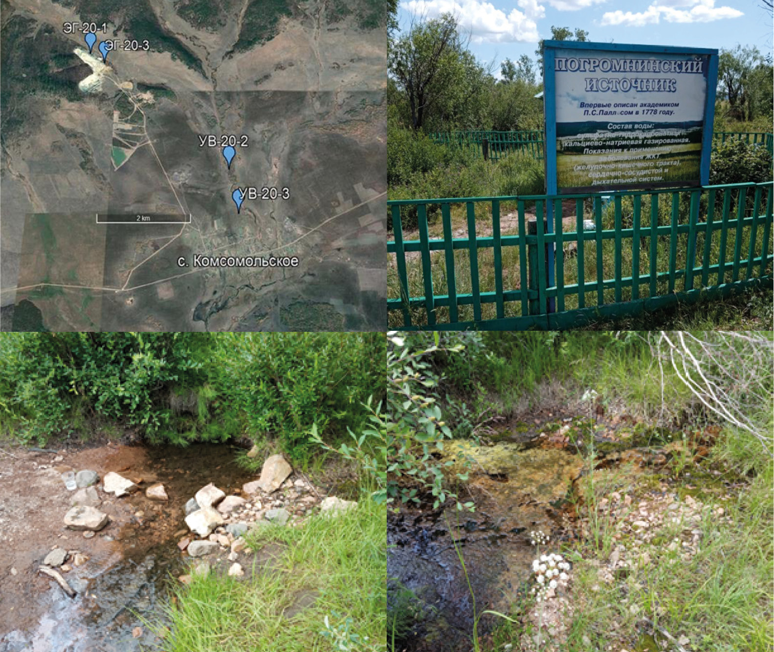 Погроминский углекислый источник находится в Еравнинском районе Республики Бурятия в 1.7 км к северу от центра с. Комсомольское (рис. 1, точка УВ-20-2). Ранее указывалось, что источник находится в 3.0 км от села [12]. Современный выход его приурочен к протоке р. Погромки в точке с координатами 52°29.929' с. ш., 111°05.306' в. д. Источник имеет две головки, отстоящие на 5–6 м друг от друга, с расходами на дату опробования (15 июля 2020 г.) по 0.1–0.15 л/с каждая. Самодеятельный забор воды для питья происходит из западной головки, имеющей вид овального треугольника размером 1.0–1.2 м глубиной до 0.3 м под уступом высотой около 1 м. Газирование слабое, одиночными или короткими сериями пузырьков. Восточная головка находится в узкой слабо врезанной старице, заросла водорослями. Железистых отложений на источнике нет. Территория вокруг источника огорожена штакетником, построена беседка.