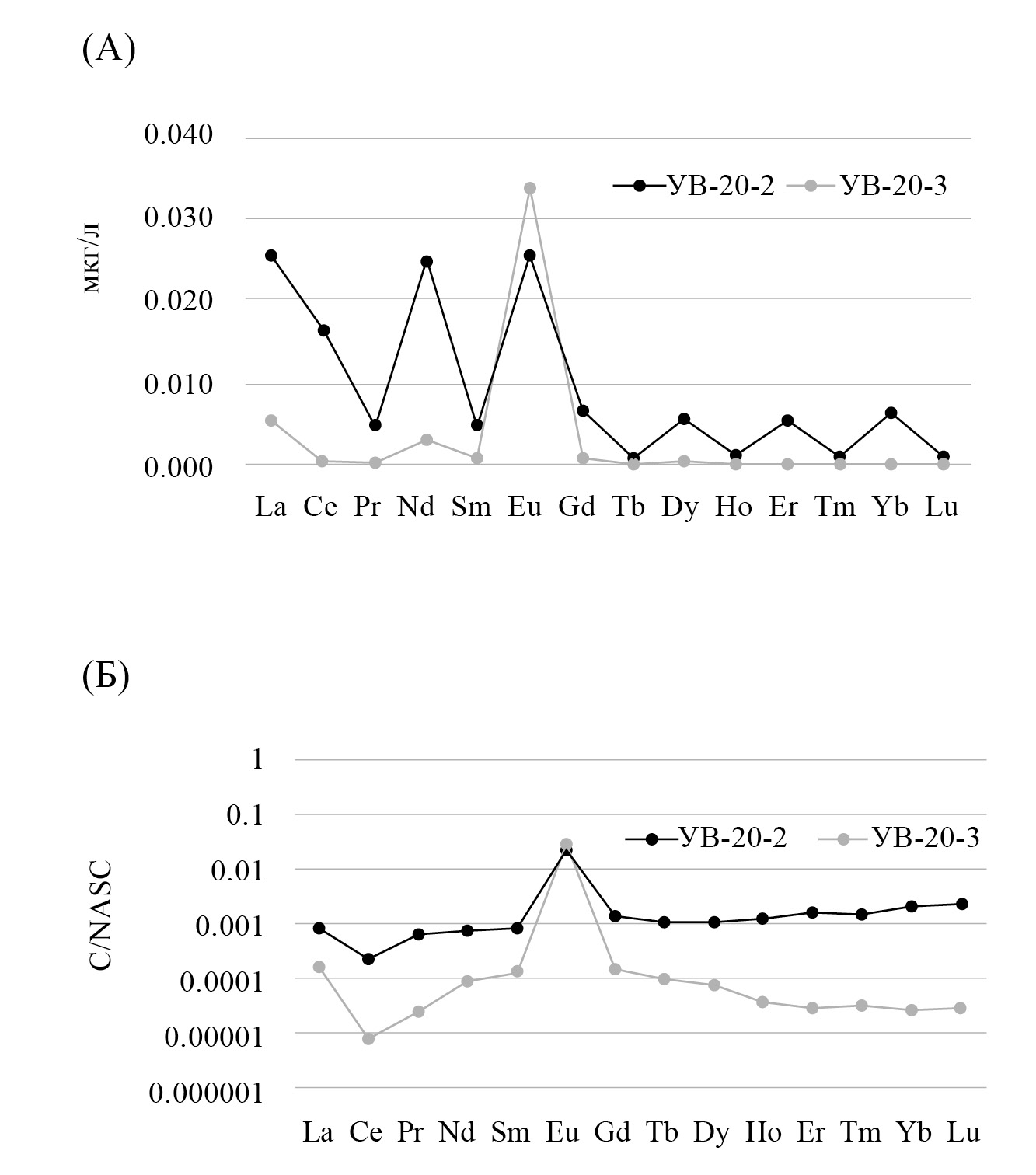 Fig. 2. Distribution of weight (a) and North American shale normalized (NASC) [15] (б) REE concentrations in spring (УВ-20-2) and borehole water (УВ-20-3).