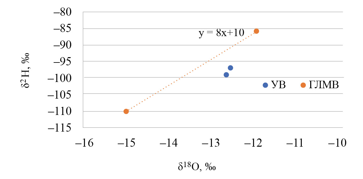 По нашим данным изотопные отношения воды источника равны по кислороду δ18O –12.7 и по водороду δ2H –99.0‰, скважины –12.6 и –97.0‰. Изотопные характеристики гидрокарбонатов по δ13СPDB –2.9 по источнику и –3.2‰ по скважине, кислорода соответственно 13.2 и 18.5‰ по SMOW. Приведенный в [5] изотопный состав воды источника полностью совпадает с нашими данными, тогда как по углероду сильно расходится — δ13СPDB равно 5.8‰, хотя опробование выполнено с временным разрывом всего около одного месяца. В свободном углекислом газе источника δ13С равно –6.7‰ [9]. Поскольку предполагать участие вулканогенной составляющей по геологическим условиям места локализации рассмотренных проявлений углекислых вод нет оснований, углекислый газ метаморфогенный с участием биогенного, хотя значение δ13С попадает в интервал мантийного углерода (–4… —8‰). Точки изотопного состава воды на графике δ2H – δ18O ложатся недалеко от Глобальной линии метеорных вод Крейга (рис. 3), что свидетельствует о ее инфильтрационном генезисе. Более легкий изотопный состав по кислороду по отношению к ГЛМВ вызван фракционированием в системе вода–гидрокарбонат.